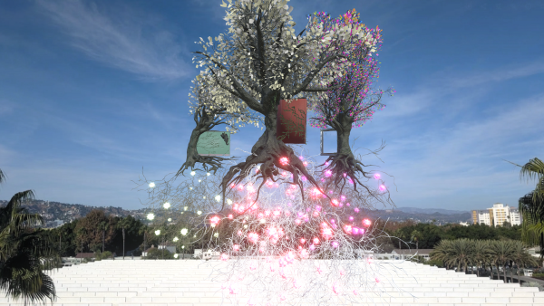 Nancy Baker Cahill's monumental interactive AR experience Substrate (now on view through August 24, 2025) invites the viewer to consider connections between knowledge-making organizations by contributing their own descriptions of culturally significant artifacts. The project borrows imagery and examples from networks in nature and depicts three cultural institutions—LACMA, the Los Angeles Public Library’s Central Library, and California’s system of community colleges—as abstracted, interlocking trees with root systems and mycelial networks that produce essential nutrients for human health and well-being. The work is part of Baker Cahill's Art + Technology Lab project of the same name, which used futuristic civics and systems thinking to demonstrate the potential of collaborations between local civic hubs. We sat down with Baker Cahill to learn more.