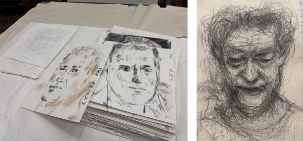 CD: At these weekly sessions, you both create only one drawing each time. Francesco provides the paper. You each select your preferred media, which is…