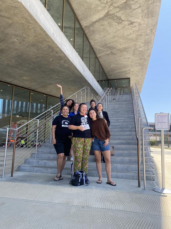 Native Voices cast and crew outside the David Geffen Galleries, from left to right: (front) Jennifer Bobiwash, Maddox Pennington, GiGi Buddie; (back) Nikcoma Lee Mahkewa, Sati Thyme, Elisa Blandford, and DeLanna Studi, photo © Museum Associates/LACMA, by Holly M.