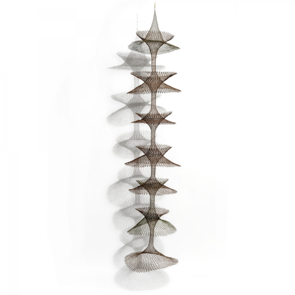 California artist Ruth Asawa’s ethereal looped-wire hangings rework the solidity of sculpture. After enrolling at Black Mountain College following World War II (when Asawa and her family were incarcerated in a concentration camp because of their Japanese heritage) she embraced what her teacher and lifelong friend Josef Albers called “the meander curved line.” Then, the summer of 1947 she visited Toluca, Mexico, where she observed local artisans forming baskets in a mesh of interlocking loops. Asawa’s signature was applying this technique to wire, a material that had also been used by the military to build camp fences, developing a unique language of open and closed forms and beginning a lifelong journey of transforming a functional technique and modest industrial materials into poetic works of art.