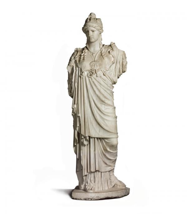“In the spirit of the David Geffen Galleries, she will be in conversation with other works of Athena to show how ubiquitous and important she was as a deity,” she says. The objects the sculpture will be displayed among include a Macedonian coin (c. 450 B.C.), on which the profile of the goddess is identifiable by her helmet, and a Greek red-figure amphora (c. 470–460 B.C.), where Athena is depicted pouring wine for Herakles.