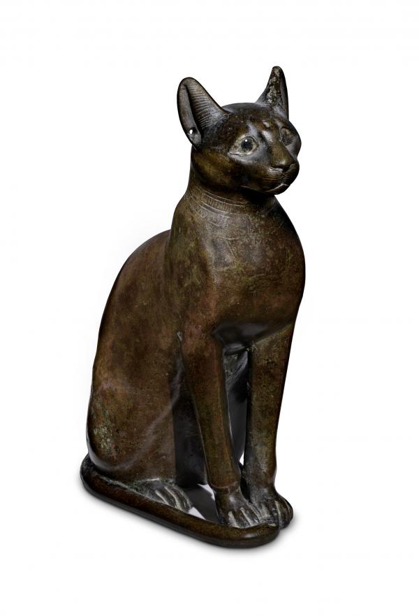 To honor the goddess Bastet, mummified cats were sometimes buried in wood or bronze coffins or in boxes topped with images of cats. This bronze example, probably too small to have served as the receptacle for a cat or kitten mummy, likely adorned a coffin for a sacred animal. Two tenons extending the base of the bronze indicate that it was attached to another object. The beautifully proportioned and contoured figure has a naturalistic and attentive posture with ears upraised and tail gracefully curved around the front paws. This pose is readily identifiable by anyone who has observed contemporary cats. Both ears have been pierced, presumably for small gold circular earrings. The incised collar shows several rows of beads bound at the back of the neck with a wadjet eye pendant on the chest, an emblem of the god Horus, symbolic of health or “wellness.”
