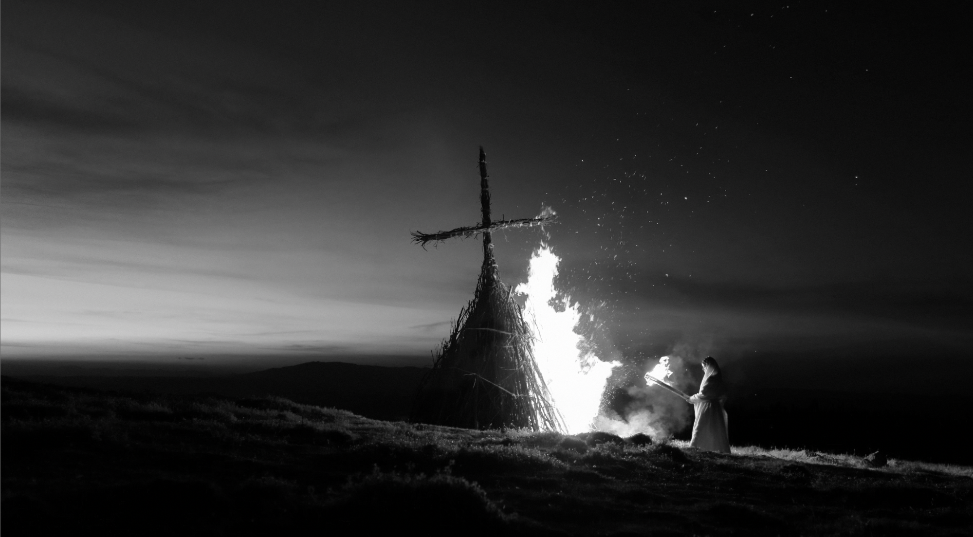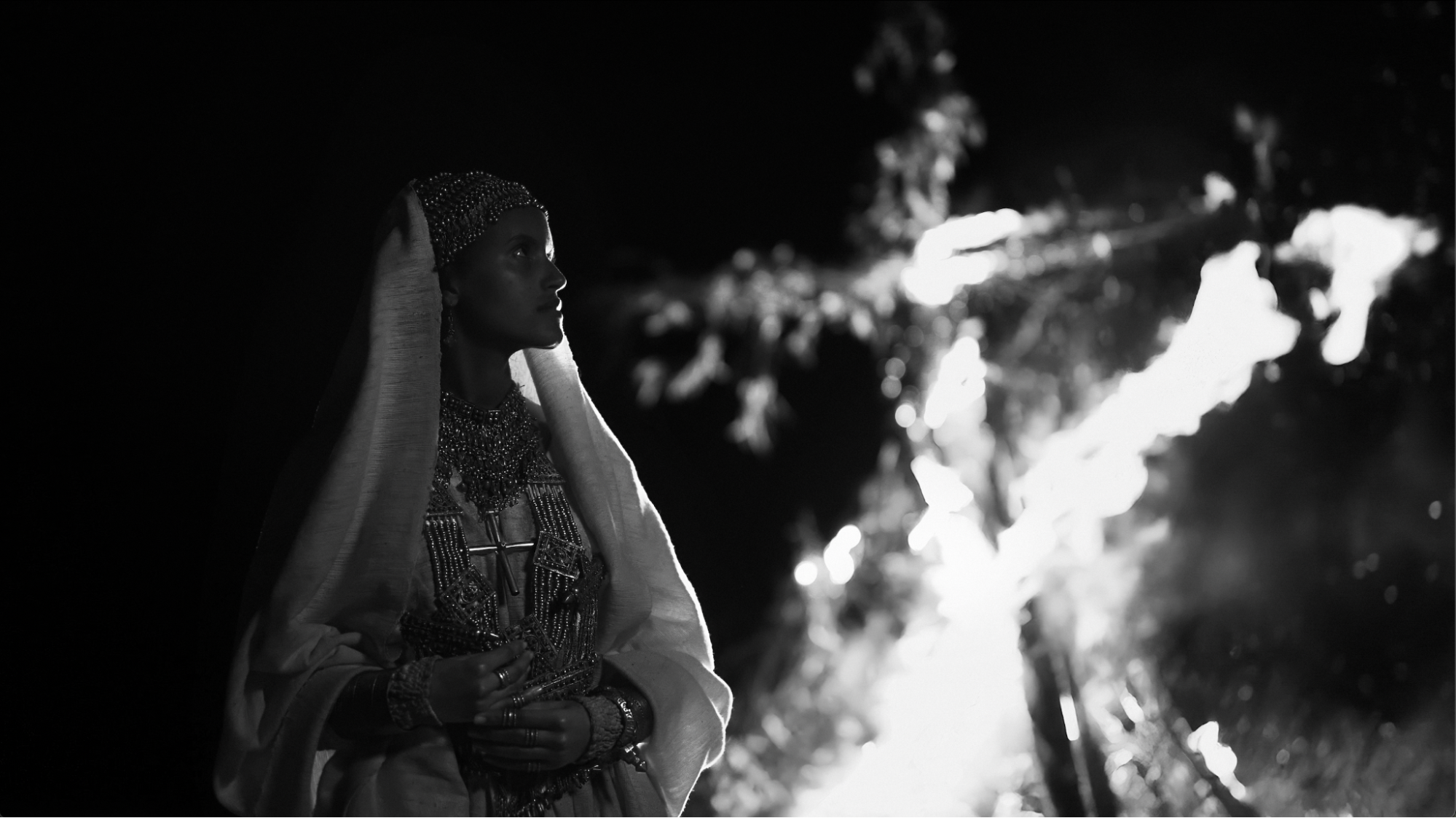 We had hidden marks made out of stones on the ground. Lydia would begin out of frame, go to the first marker, then the second, spending time in each place, while I'm calling out the numbers to direct her. But the actress had her own responsibility outside my control. Inside the pyre was full of incense, and we didn't know which way it would blow. So she really embodied Empress Eleni, following the incense where it led.