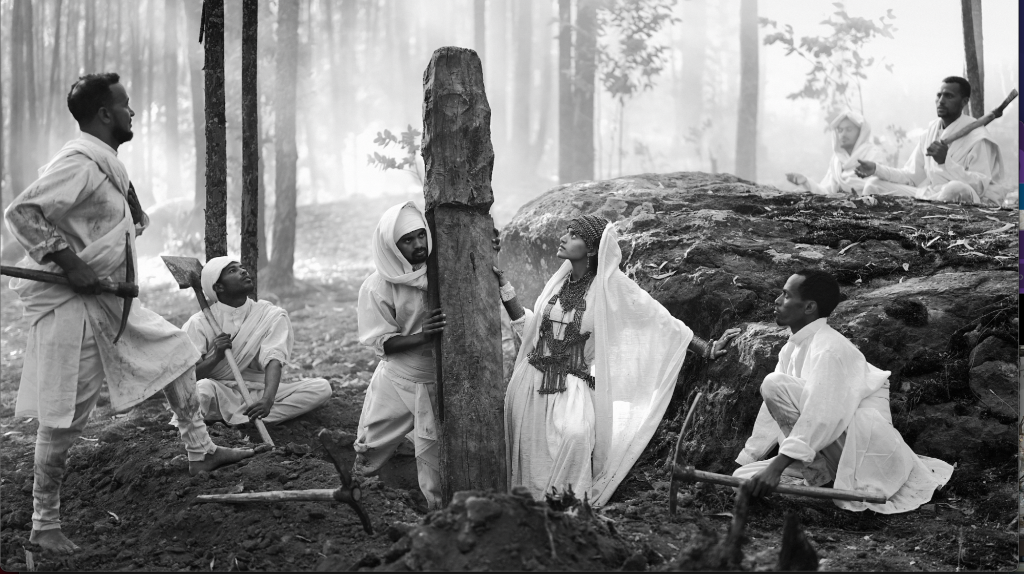 Every year in Ethiopia we celebrate Meskel, an annual tradition where we honor the finding of the True Cross. (Meskel means cross in Amharic.) The legend dates to the 4th century when Empress Eleni (known as Empress Helena in the West, the mother of the Emperor Constantine) received a divine vision that led her to discover the hiding place of three crosses used at the crucifixion of Jesus. The story goes that Empress Eleni’s vision instructed her to light a demera (large bonfire) and follow the smoke to uncover the hidden relic of the True Cross, buried beneath the earth for centuries. Local legend says that a piece of the cross discovered by Eleni remains in Ethiopia today, at Gishen Mariam Monastery, a remote church in the northern highlands. The celebration today can involve hundreds of people gathering around the demera together. But filming people celebrating is not the art for me. I wanted to go to the origin. To Empress Eleni's divine vision. The art I wanted to make was about capturing that vision itself.