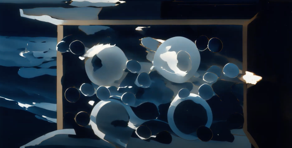 To that end, Claude Monet’s Nymphéas was included for foregrounding water as both subject and medium, offering a historical counterpoint to the fluid, algorithmically produced imagery in Diffuse Control. Rendered upon a sphere-like animation, the resulting image resembles varying hues of water droplets that disintegrate into the surface while the water lilies blossom and grow throughout the sequence. Its shifting surface and play of light echo the painting’s themes of perception, motion, and abstracted mediation. The boundaries between sky, water, and vegetation blur, creating a painting that is less about representing nature and more about capturing the experience of looking.