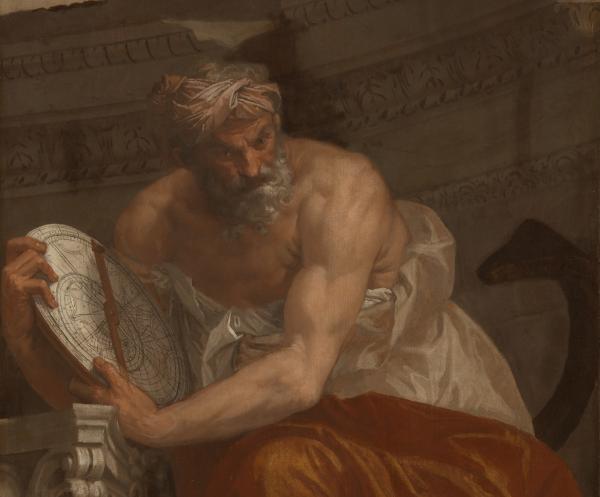 The creation of these paintings coincided with a period of heightened activity on Veronese’s part in the decoration of public monuments in Venice. They once belonged to a larger group of at least four paintings probably intended for a public library, including additional pictures of a male figure holding an armillary sphere and a female figure representing the art of Sculpture. The grouping of these paintings reflect the rich and complex culture of Veronese’s time, when art, science, literature, mathematics, architecture, and painting all went hand in hand.
