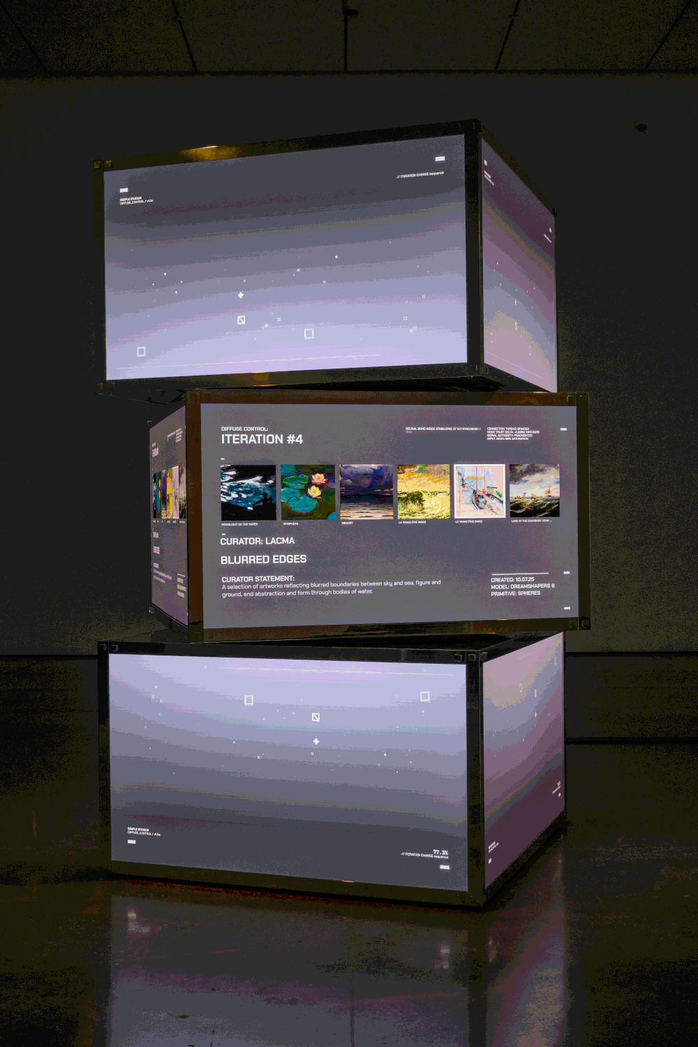 Diffuse Control is an image-generating sculpture that invites visitors to collaborate with artificial intelligence. A custom website allows participants to interact with the AI generative system, which transforms images of select public domain artworks from LACMA’s permanent collection. The sculpture—comprising 12 large video screens—displays the resulting images, allowing the audience to remix this new creation in real time and generate unique prints from the sculpture. As the exhibition progresses, the work will continue to evolve based on the input of new collaborators. Beeple’s work seeks to dissolve boundaries between artist and audience, making the creative act a shared experience.