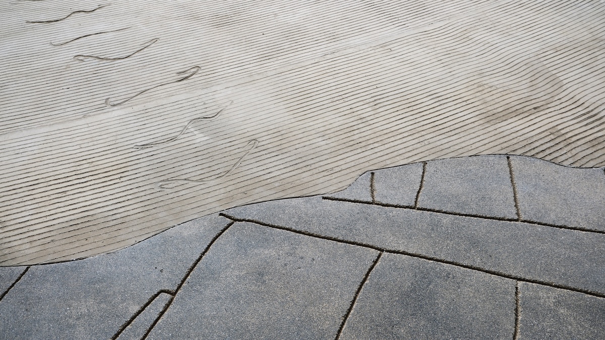 Forming the expansive floor of the plaza level of the David Geffen Galleries, Castillo Deball’s monumental Feathered Changes emanates from the architecture in undulating paths of warm concrete that mimic lines raked into sand. Visitors who move across and along the pavement’s meditative striations encounter the footprints of other beings—coyotes, bears, racoons, roadrunners—who have long traversed this landscape.
