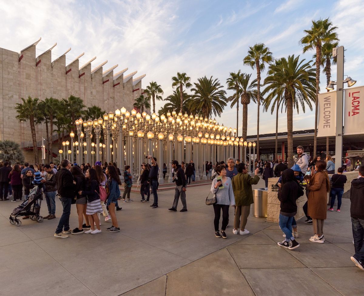 Visitors with Chris Burden’s Urban Light (2008) at the Los Angeles County Museum of Art, 2020, art © Chris Burden/licensed by The Chris Burden Estate and Artists Rights Society (ARS), New York, photo © Museum Associates/LACMA