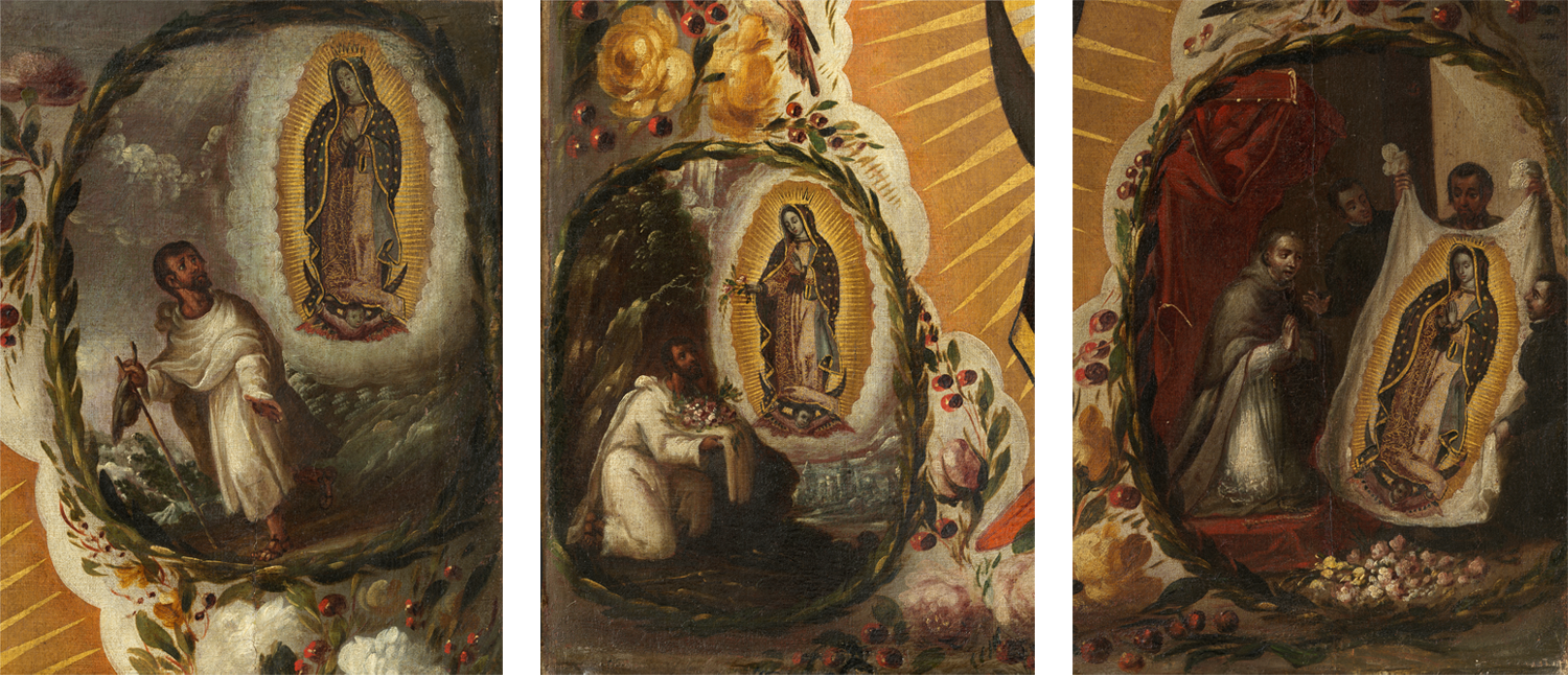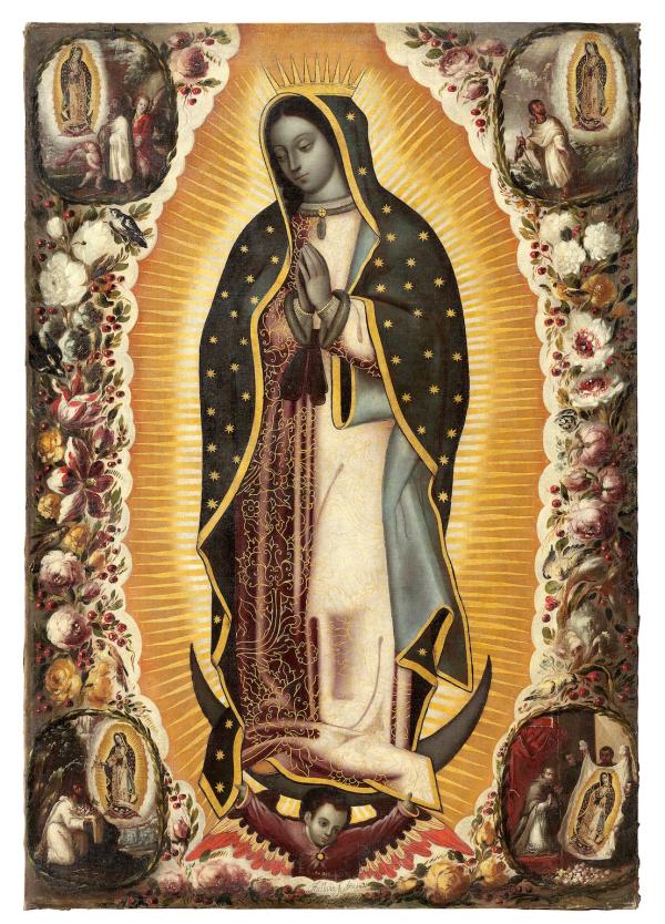 Our Lady of Guadalupe is one of the most reproduced images in the Christian world. This painting by Antonio de Arellano (1638−1714) and his son Manuel de Arellano (1662−1722) depicts the Virgin surrounded by four vignettes that narrate her miraculous apparitions. According to tradition, in 1531 the Virgin appeared several times to the Indigenous commoner Juan Diego, asking him to visit Bishop Juan de Zumárraga (r. 1528−47) so he could build her a chapel at the hill of Tepeyac, north of Mexico City. At first, the bishop refused to believe Juan Diego, who then unfolded his cloak filled with the rare flowers that the Virgin had sent as proof, revealing her miraculously imprinted image. In awe, the bishop fell to his knees and begged the Virgin for forgiveness. Legend has it that the image on Juan Diego’s cloak is the one venerated today at the Basilica of Guadalupe in Mexico City, which continues to attract millions of pilgrims each year.