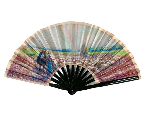 Can you describe the artwork in the exhibition, Pissarro’s Shepherds in the Fields with Rainbow, that inspired the design of the fan?