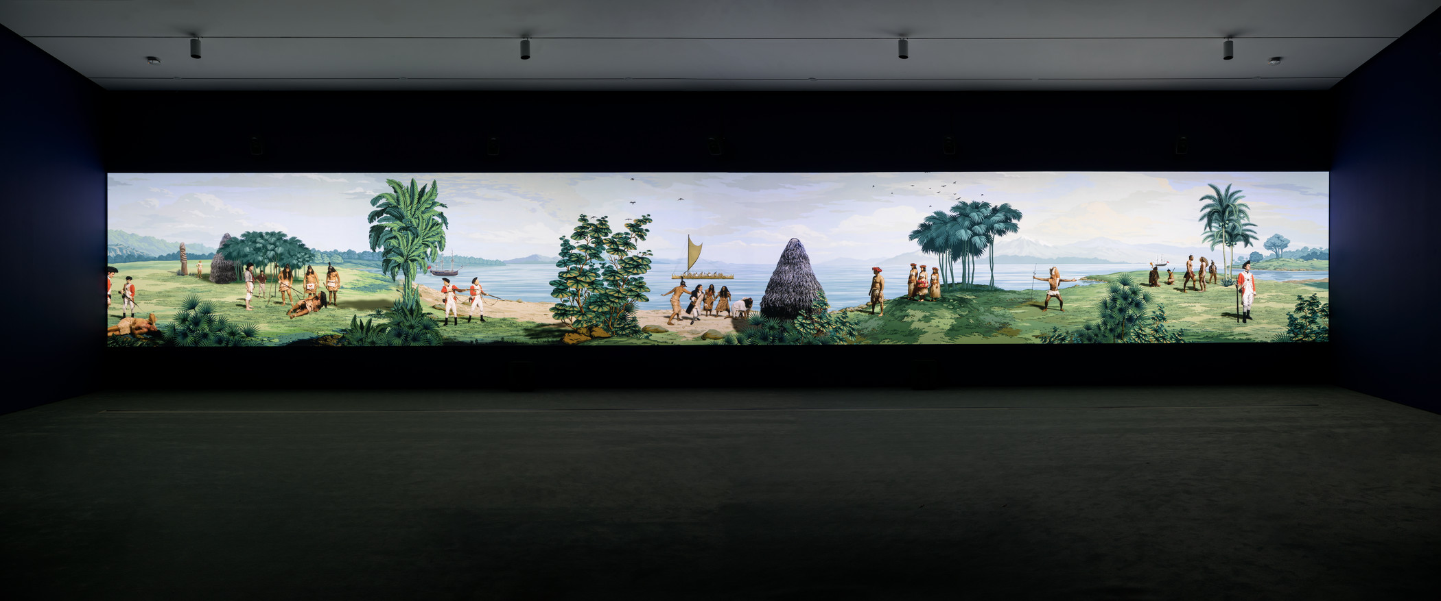 Installation photo featuring Lisa Reihana's In Pursuit of Venus [Infected] (2015–17), in the exhibition Grounded, at the Los Angeles County Museum of Art, September 14, 2025–June 21, 2026, © Lisa Reihana/Artprojects, photo © Museum Associates/LACMA, by Jonathan Urban