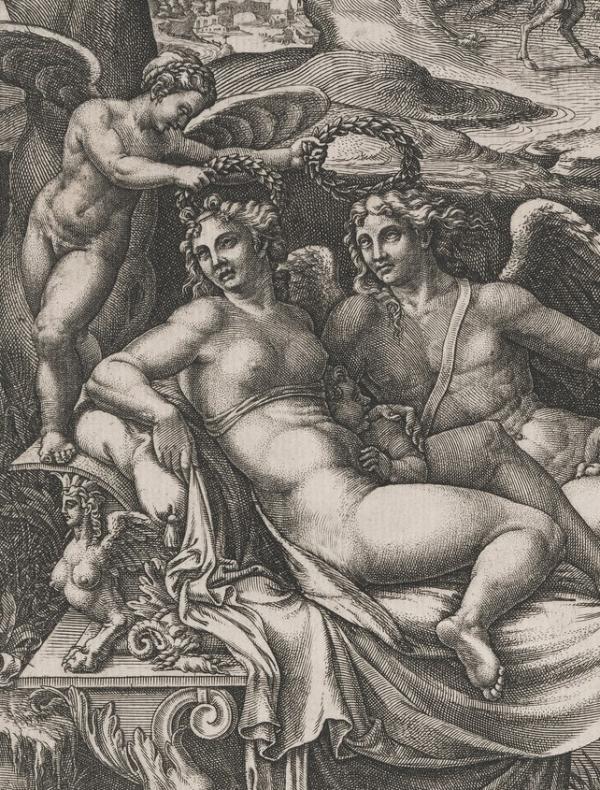 Subtle differences between the print and the fresco, such as the addition of foliage at the base of the bed or the billowing smoke beyond, suggest that Ghisi based this print not on the fresco itself, but rather on an early stage preparatory drawing by Giulio Romano, now presumed lost. Throughout his career, Ghisi traveled in Europe, creating engravings after various artists, including many site-specific works like the Palazzo Te frescoes. However, he was perhaps best known for his works after Giulio Romano, who was active in Mantua as the court painter to the Gonzagas during Ghisi’s early career, and may have shared his drawings with the engraver. Here, the sensual subject matter is enhanced by Ghisi’s skill in handling the engraving burin, producing velvety shadows in contrast to the bright light of the bare sheet, showing at once the various textures of the body, luxurious fabrics, and richly dense foliage.
