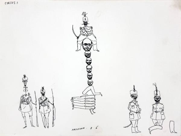 Born in Rasht in 1938 and trained in political science and law at Tehran University, Mohassess became modern Iran’s most influential social satirist. A self-taught artist, he produced remarkably precocious drawings from a young age; his first works were published while he was still a teenager in Towfiq, Iran’s leading satirical and literary journal. His practice intersected with popular culture—including Hollywood films—as well as royal imagery associated with the Qajar dynasty (1789–1925), predecessors of the Pahlavis. Calling himself “just a reporter,” Mohassess believed that “a simple line is the mother of images, capable of soaring, cursing, mourning, and wounding.” His razor-sharp black linework and fearless critiques of both the monarchy and the clergy—some published in Kayhan, one of Iran’s most influential daily newspapers—led to increasing censorship and police harassment, prompting his departure from Iran in 1976. After relocating to New York’s Greenwich Village, where he lived in self-imposed exile until his death in 2008, his work reached international audiences through The New York Times, The Nation, and other major publications.