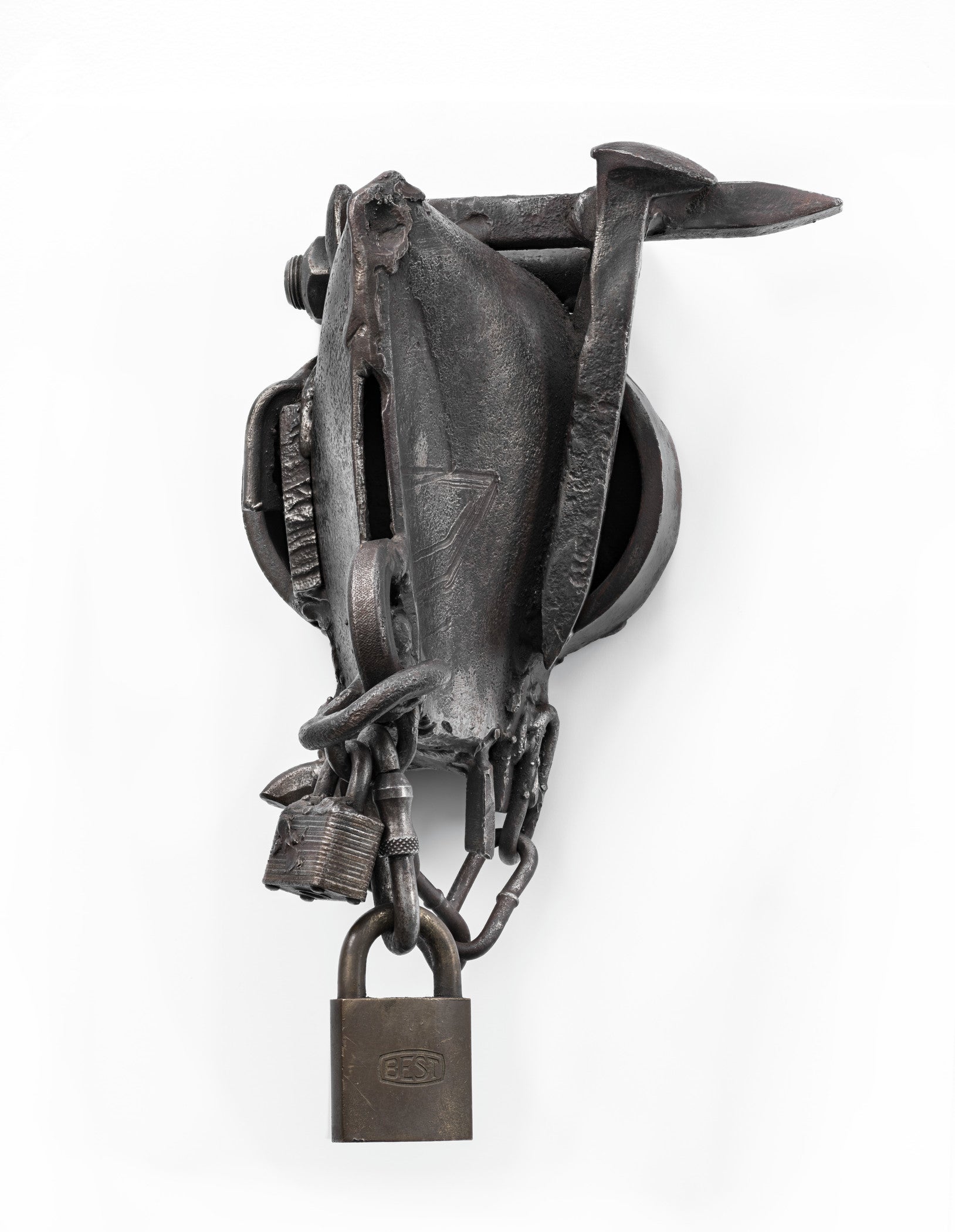 In 1963, he began his now celebrated Lynch Fragments series: compact, abstract metal assemblages made of found objects—chains, meathooks, barbed wire, padlocks—and scrap metal (which he carefully distinguished from junk). Some Bright Morning (1963) was the first Lynch Fragment: its sharp edges and protruding forms evoke shackles, hammers, and daggers, creating an unequivocal sense of violence and danger. Over his lifetime, Edwards made over 300 Lynch Fragments, including LACMA’s Go (1980), each deliberately mounted against the wall, hung at the artist’s eye level. These compact assemblages evoke the dynamics of hanging and suspension in both a physical and historical sense. Returning to this series throughout his career, in 1993 Edwards reflected, “The Lynch Fragments have changed my life. They made this life of 30 years as a sculptor. They are the core to all the work. If anybody ever knows I lived, this is going to be why.”