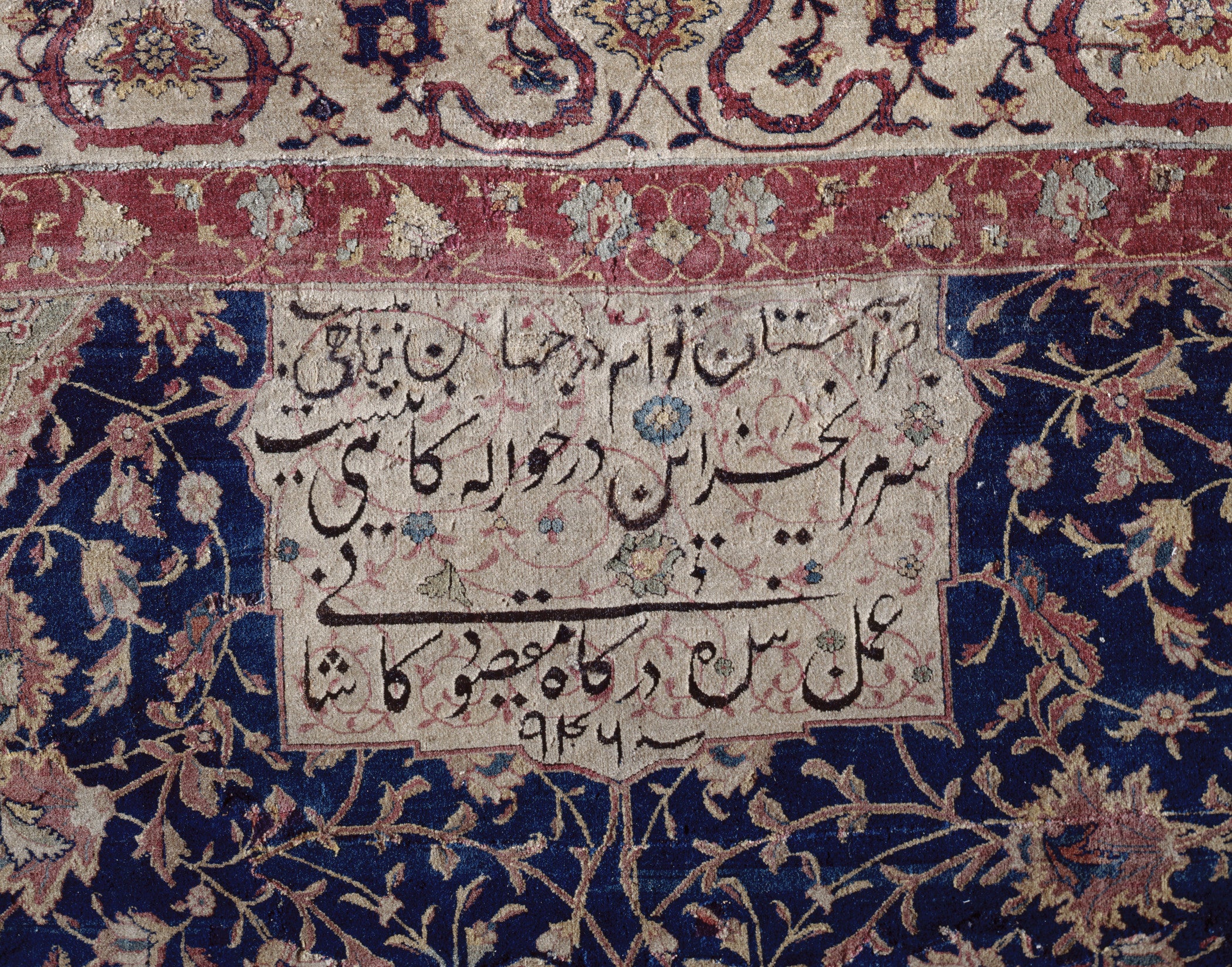 Predominantly blue, red, and yellow, the overall composition of the carpets—based on a central medallion with radiating pendants and quarter medallions repeated in the corners (only partially preserved on the LACMA example)—is ultimately derived from contemporary and earlier bookbinding and manuscript illumination. According to their dated inscriptions, the pair were made in 1539−40 by Maqsud of Kashan, a self-styled servant of the court, probably the designer who prepared the patterns and oversaw the project. He would also likely have been the one to select the Persian couplet inscribed just above the signature and date, which is from a ghazal (ode) by the preeminent 14th-century lyrical poet Hafiz. In the context of the carpets and their location at the shrine, his words take on added meaning: