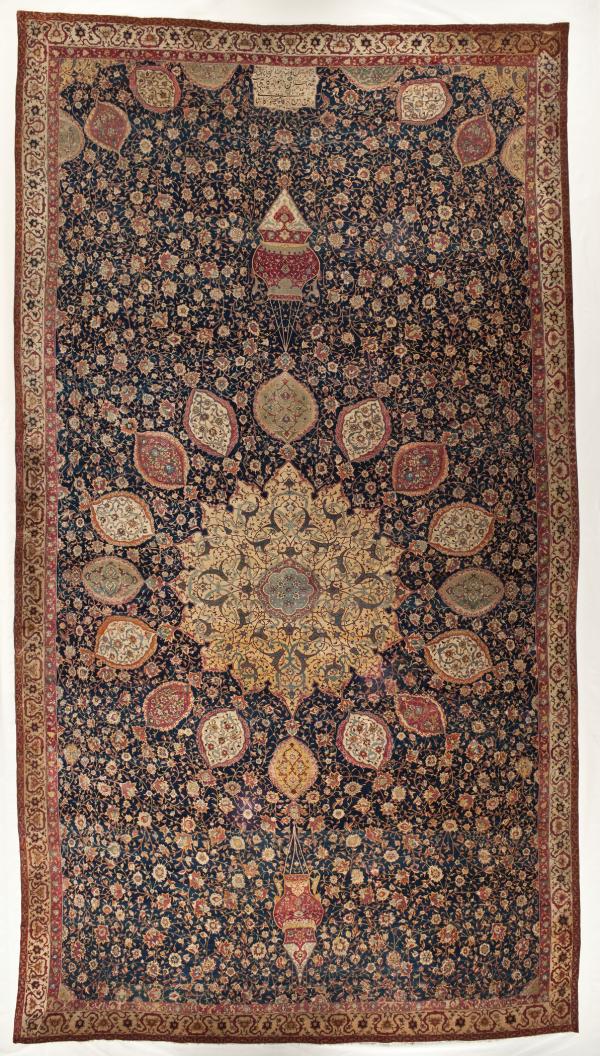 Carpets are perhaps the best-known artworks from historical Islamic lands, with the most celebrated examples originating in Iran. Due to their fragile nature, Persian carpets have only survived from the 16th century onward, although woven carpets have a longer history. The most renowned of all is a matched pair known as the Ardabil carpets—this one at LACMA and its counterpart in the Victoria and Albert Museum, London. Brought to England in the late 19th century, they were reported to have come from the ancestral shrine of the Safavid dynasty at Ardabil, in northwestern Iran. They are exceptional works of art not only for their design—which uniquely features lamps hanging from the top and bottom of their central medallions—but also because each is signed and dated.