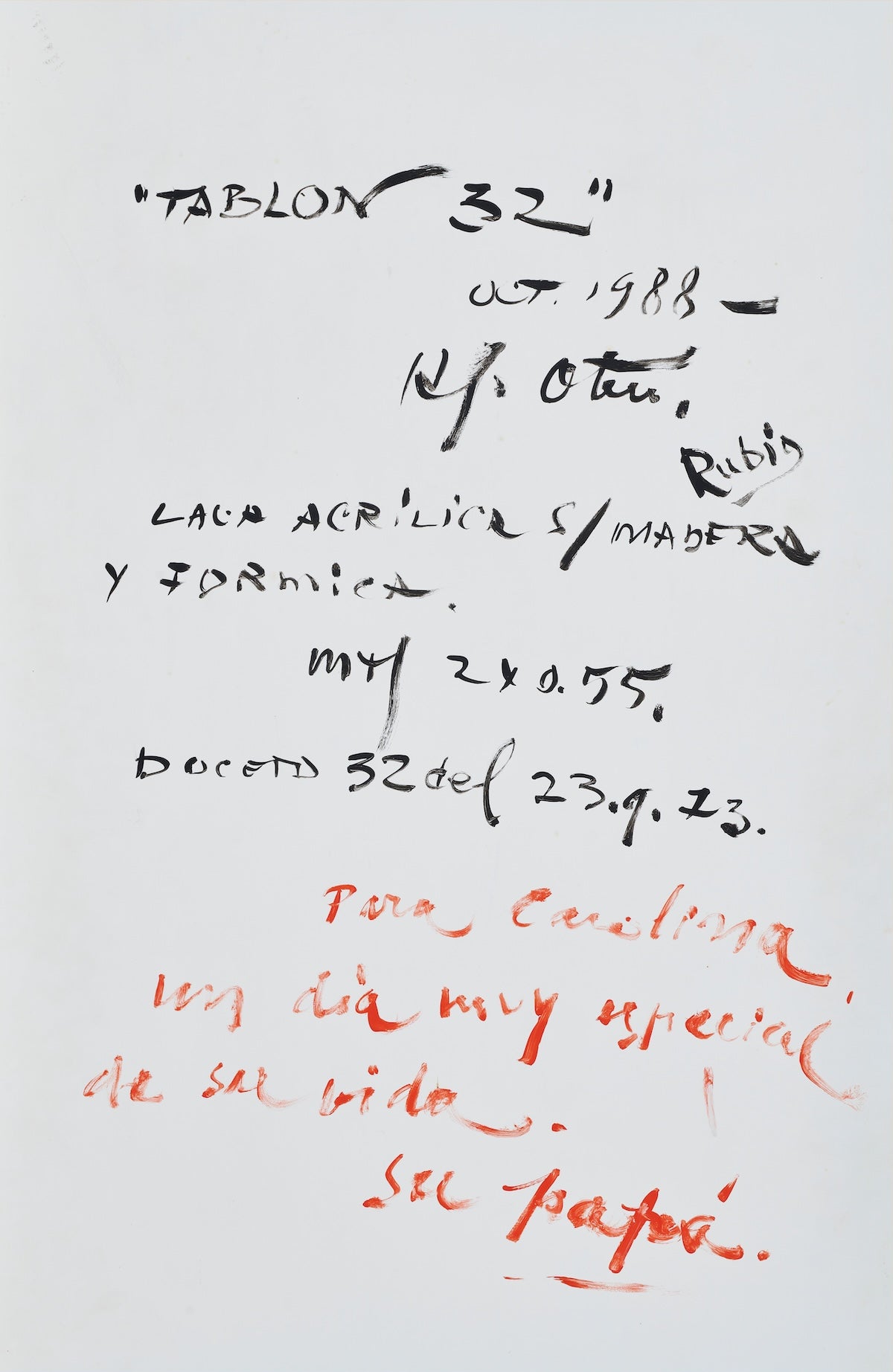 Across his Tablones series, Otero often collaborated with Pedro García Rubio, an experienced automobile painter who had restored some of Otero’s earlier Coloritmos (Colorhythms)—tall, vertical panels also painted with Duco. The back of Tablón 32 is inscribed with Rubio’s name, opening up important questions about the nature of collaborative artistic practices (see, for example, Francis Alÿs’s series of sign or rotulista paintings, where he questions the idea of originality and copies). Tablón 32 also includes a loving dedication from the artist to his daughter Carolina, to whom he gifted the work in 1988 on the occasion of her wedding: “Para Carolina. Un día muy especial de su vida. Su papa” (For Carolina. A very special day of your life. Your dad).